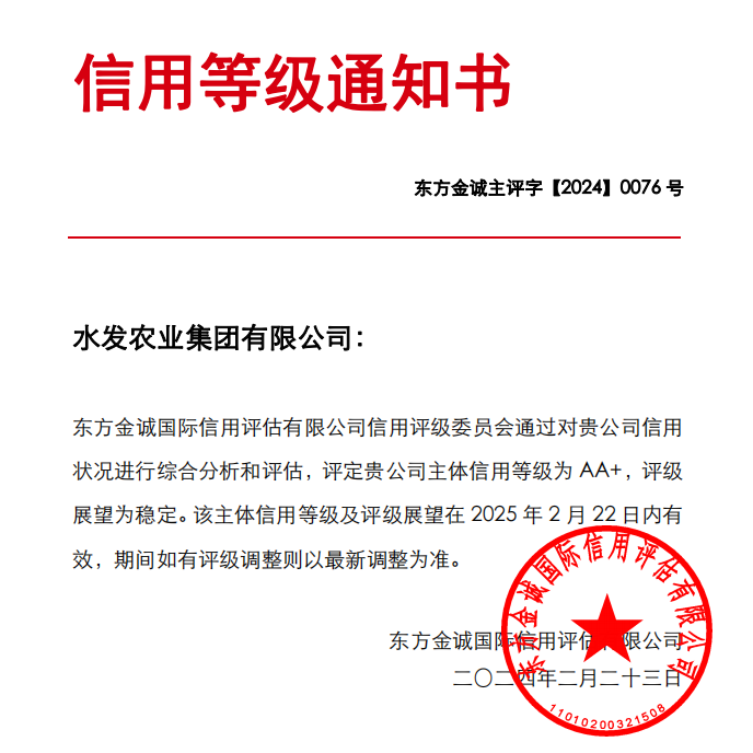 水發農業集團榮獲AA+主體信用評級
